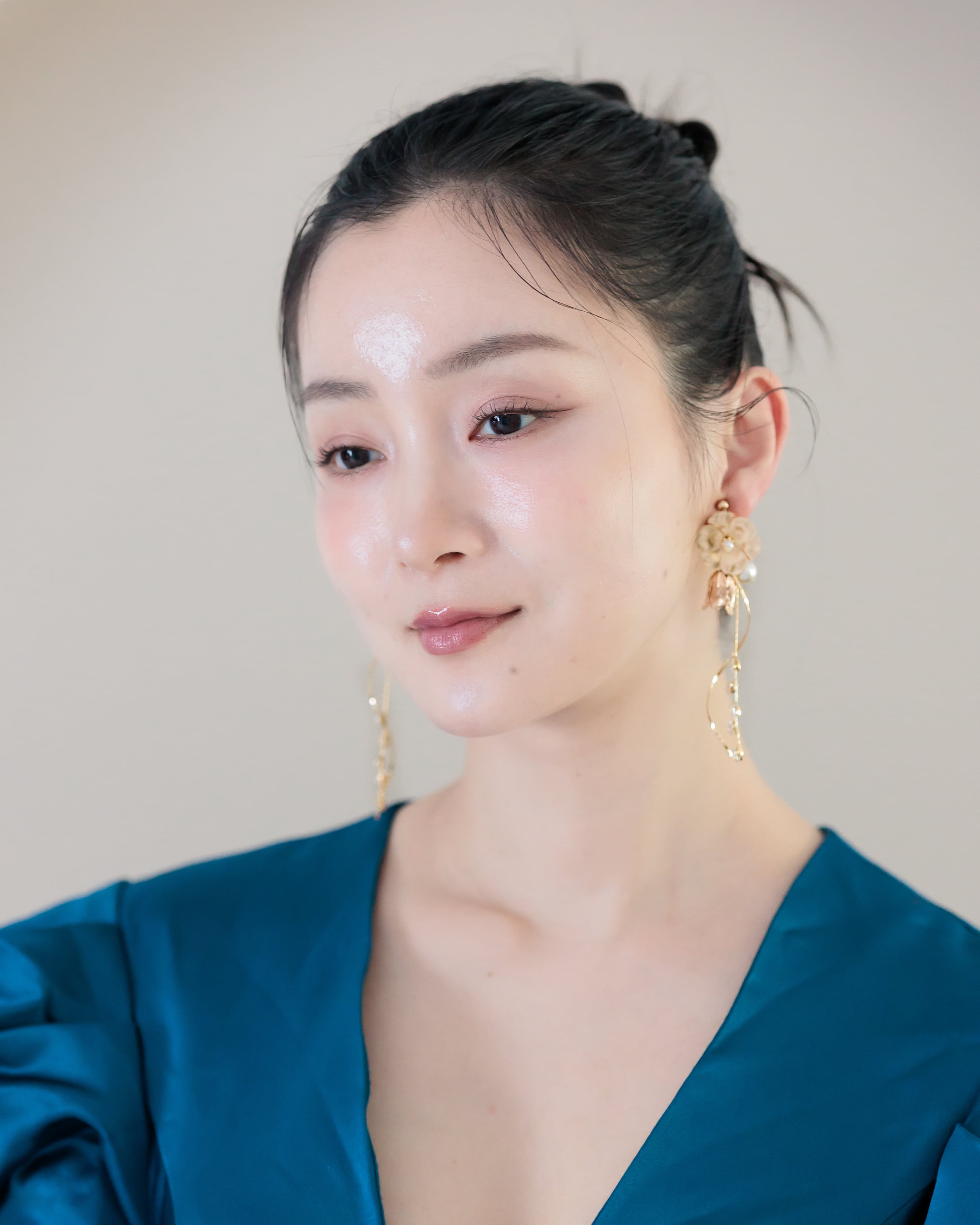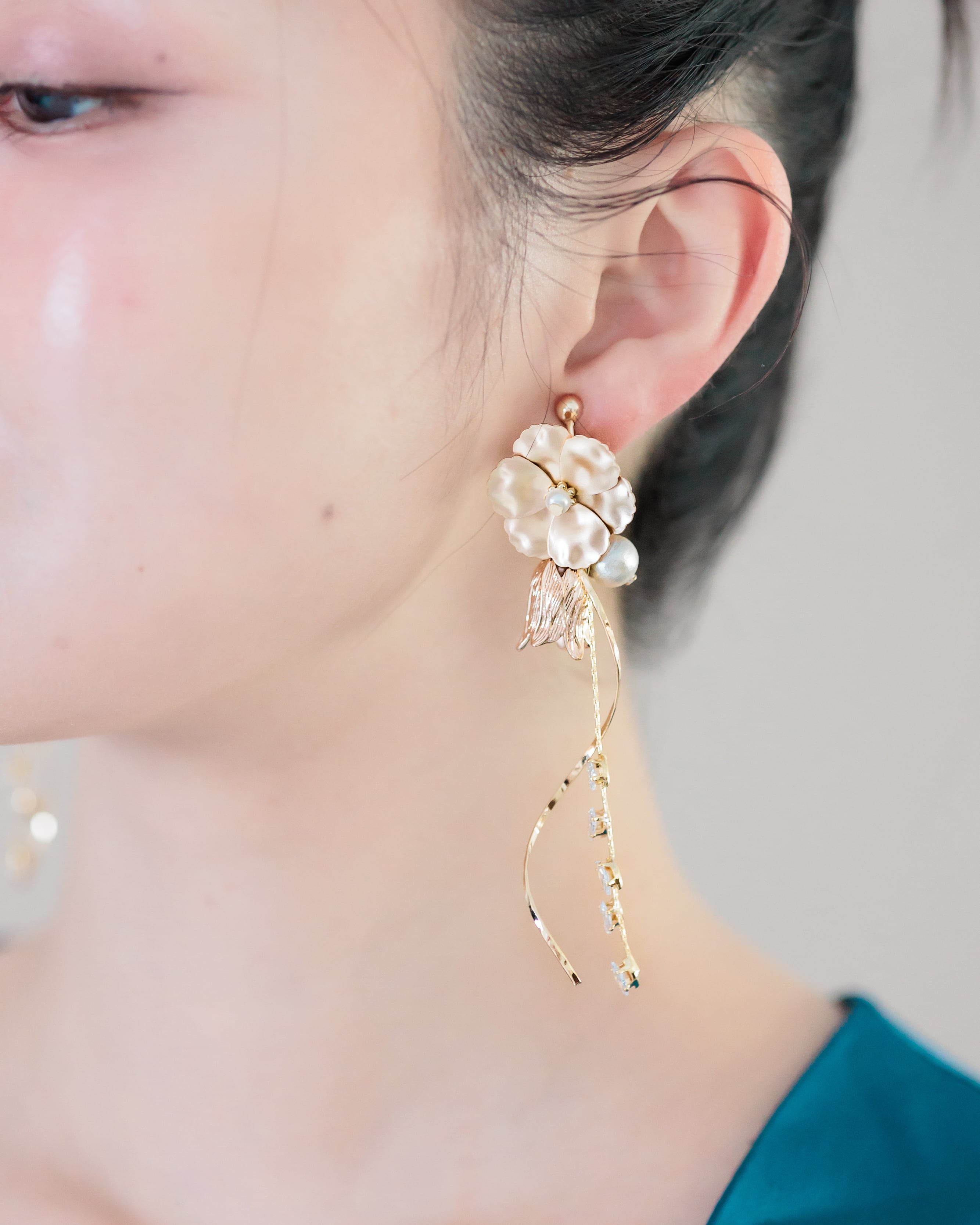 コットンパールやジルコニアストーンをあしらったリーフタッセルが上品さと華やかさをプラスし、可憐ながらも華麗な大人の雰囲気を演出。