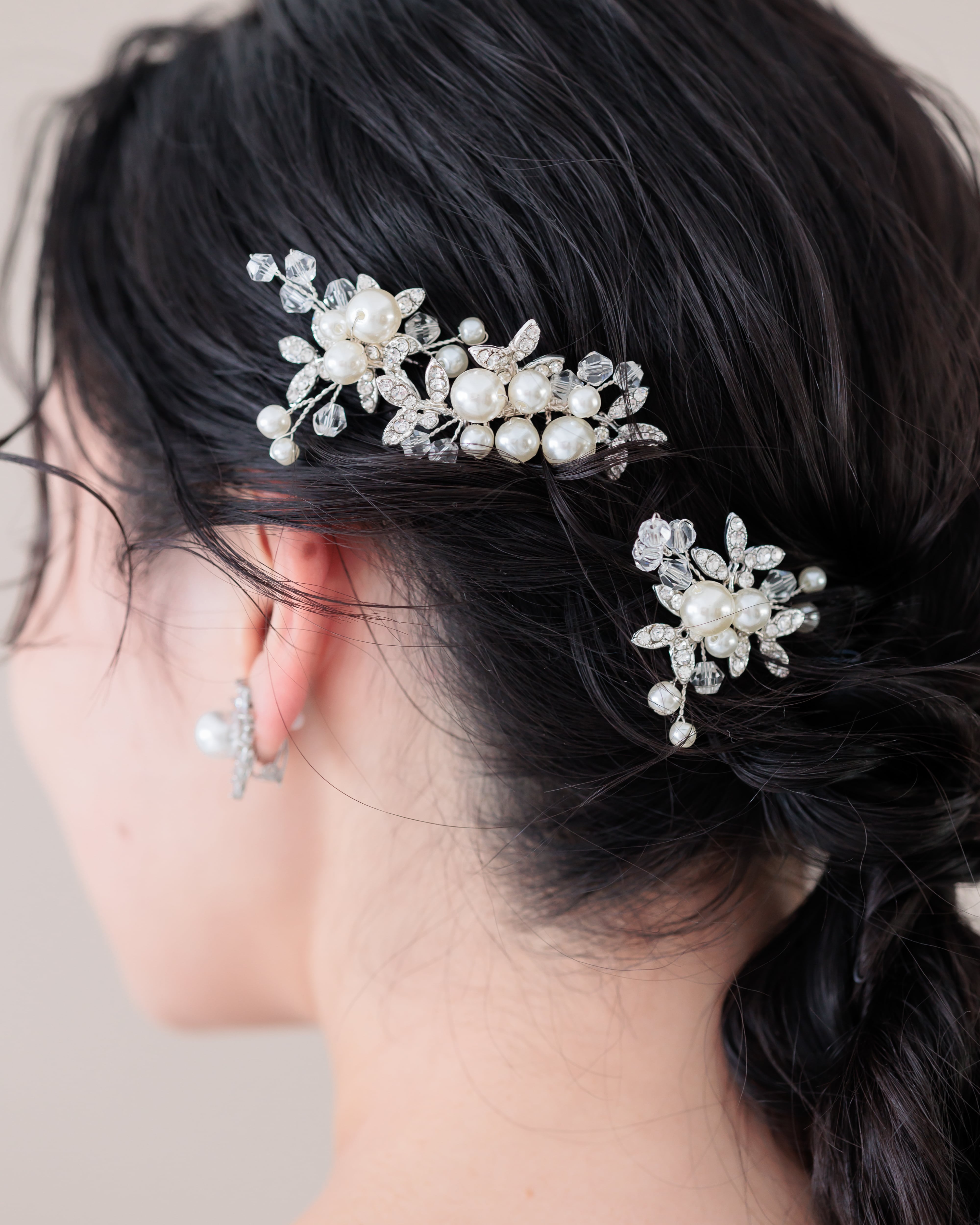 パールとラインストーンをあしらったシルバーのリーフが織りなすクラシカルでエレガントな雰囲気のヘアアクセサリー。