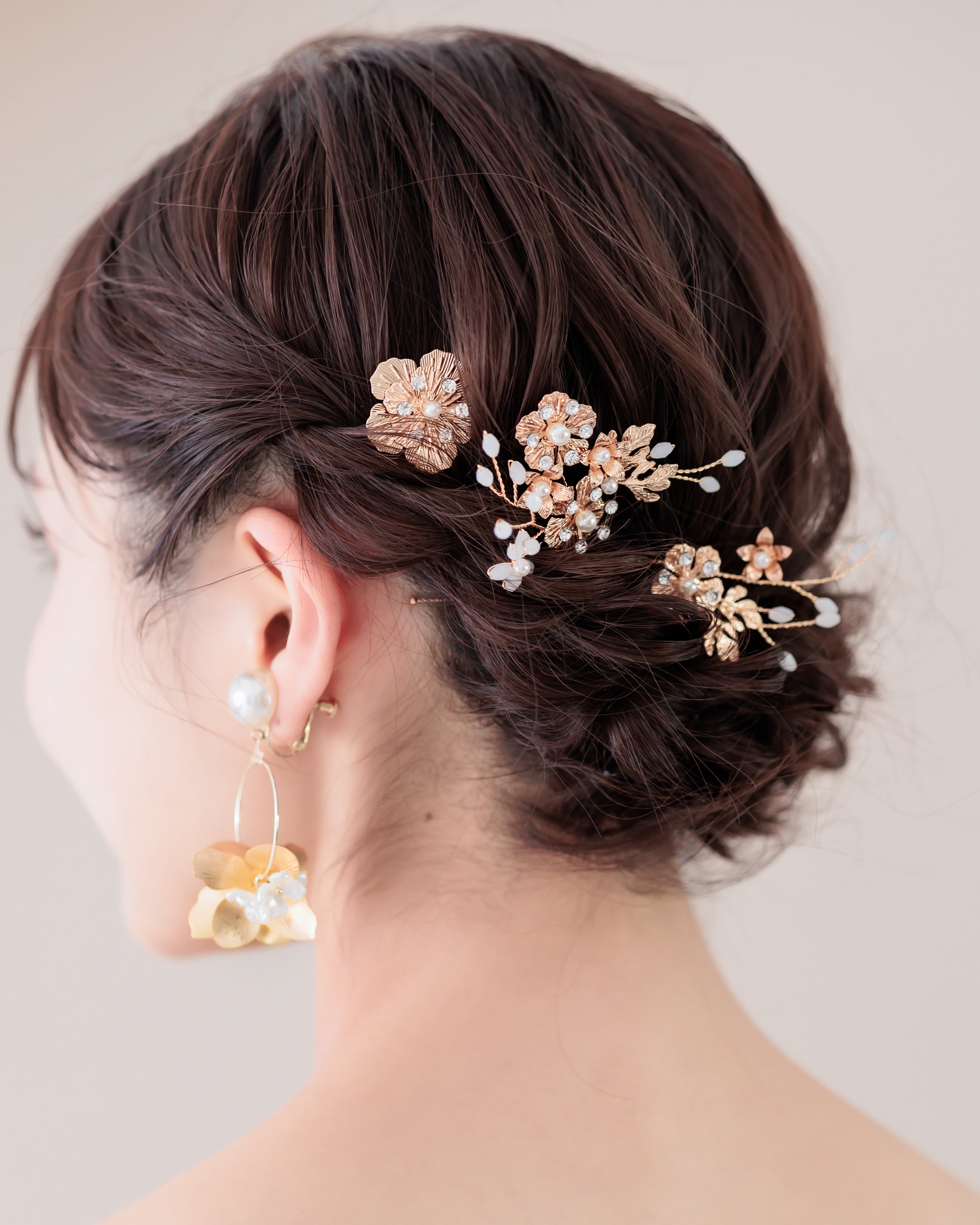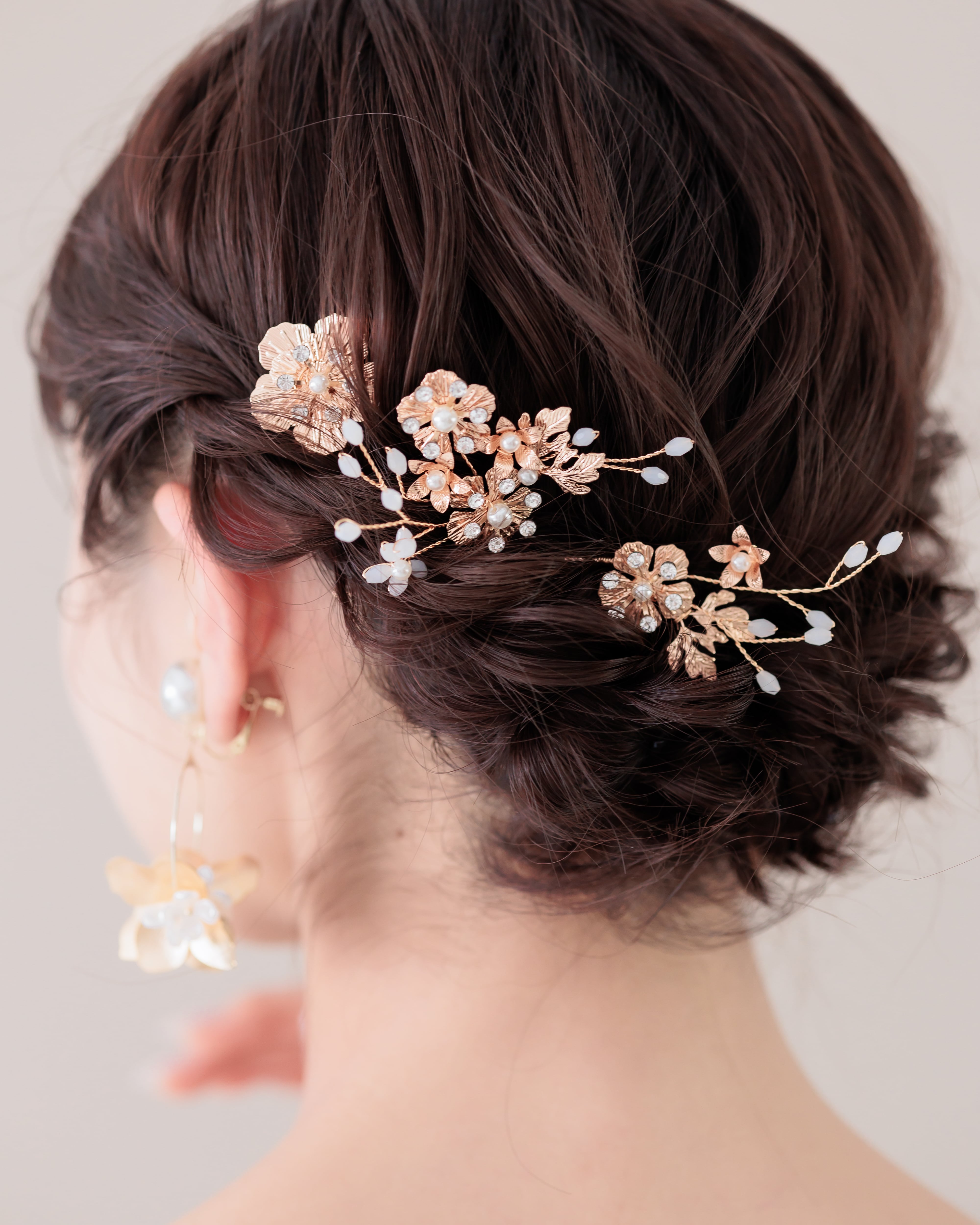 トレンド感あるゴールドのお花にパールとラインストーンの花芯がエレガントさをプラスし、旬のスタイルに上品さを醸し出します。