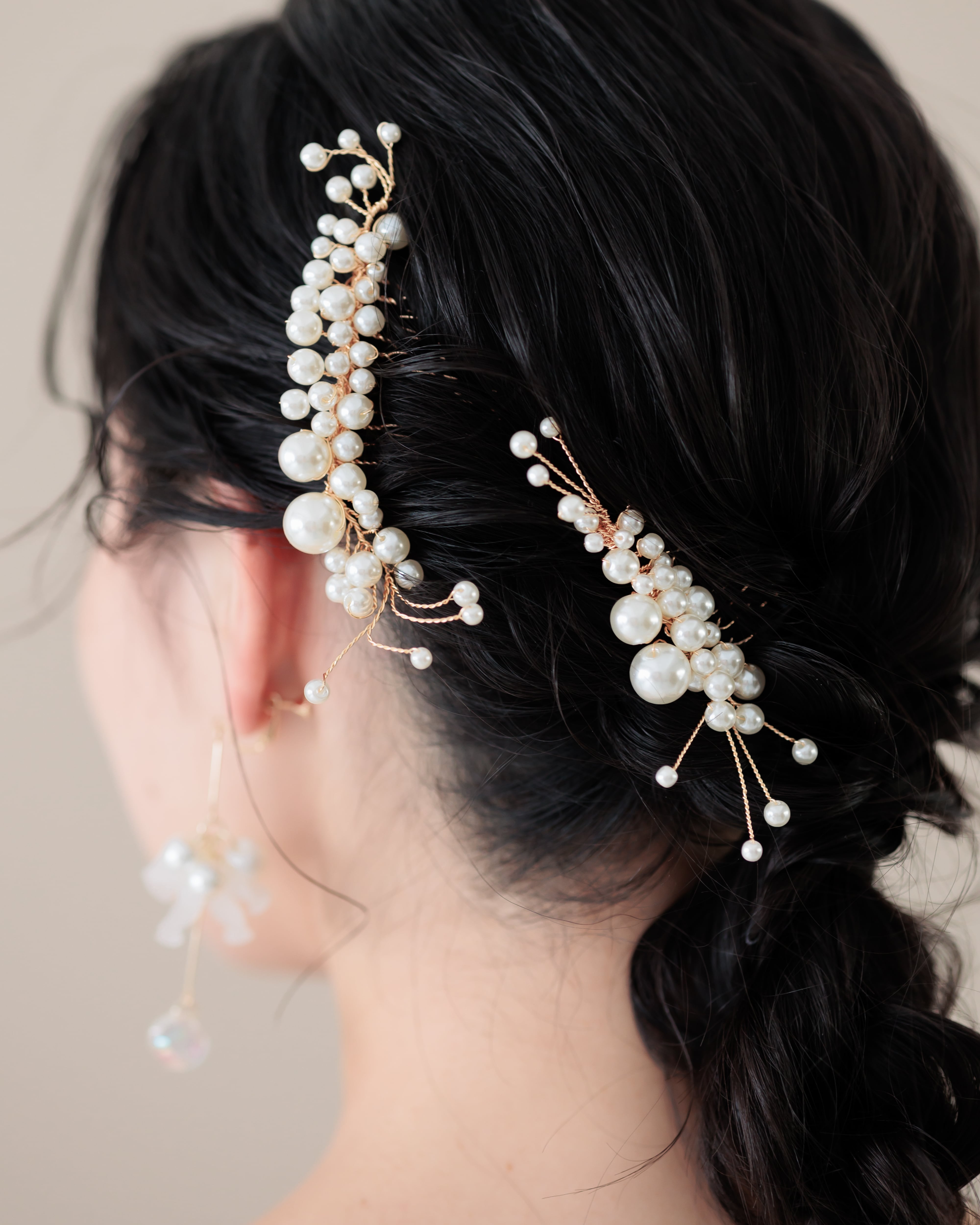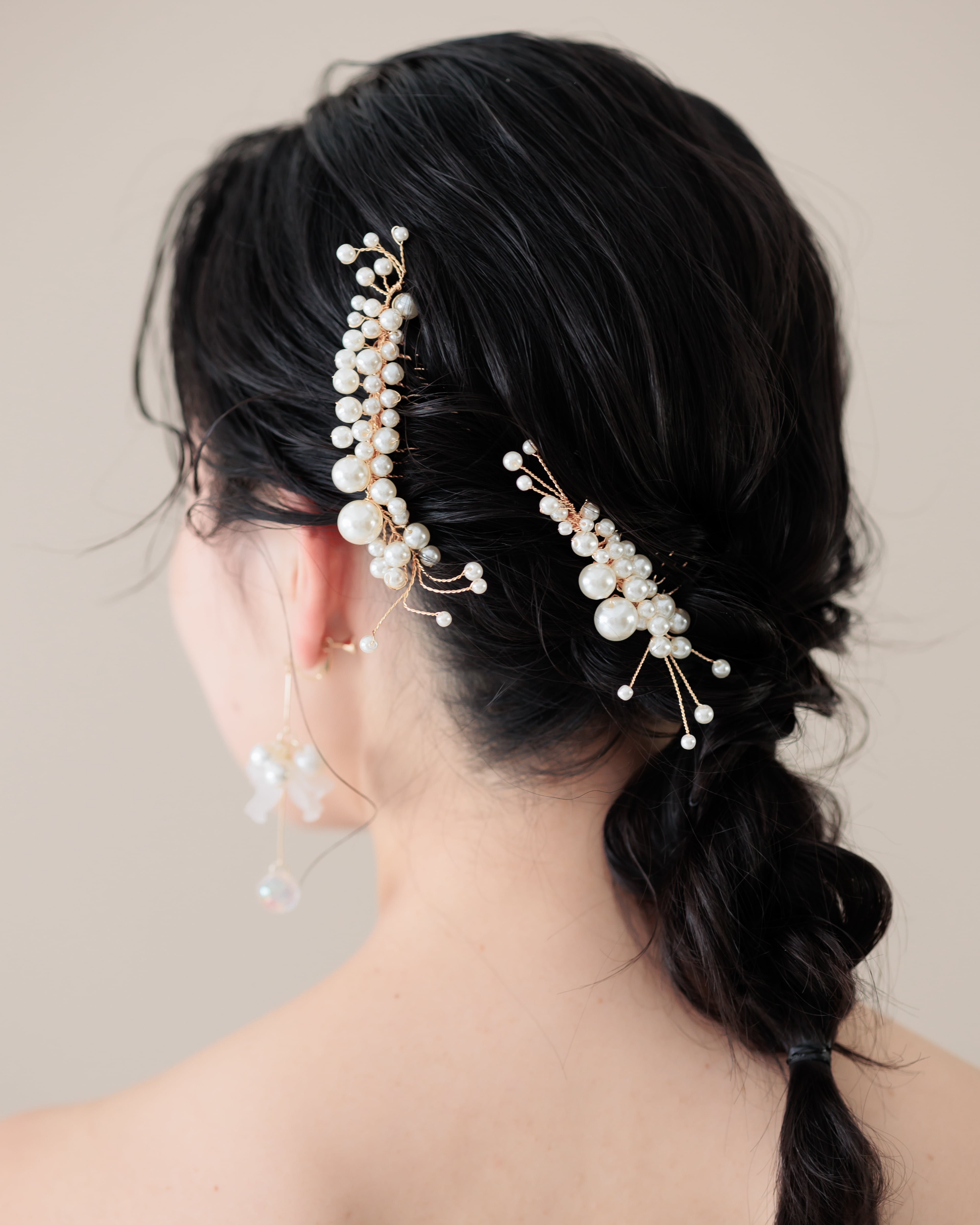 パールをゴールドのワイヤで紡いだシンプルながらフェミニンでエレガントなヘアアクセサリー。