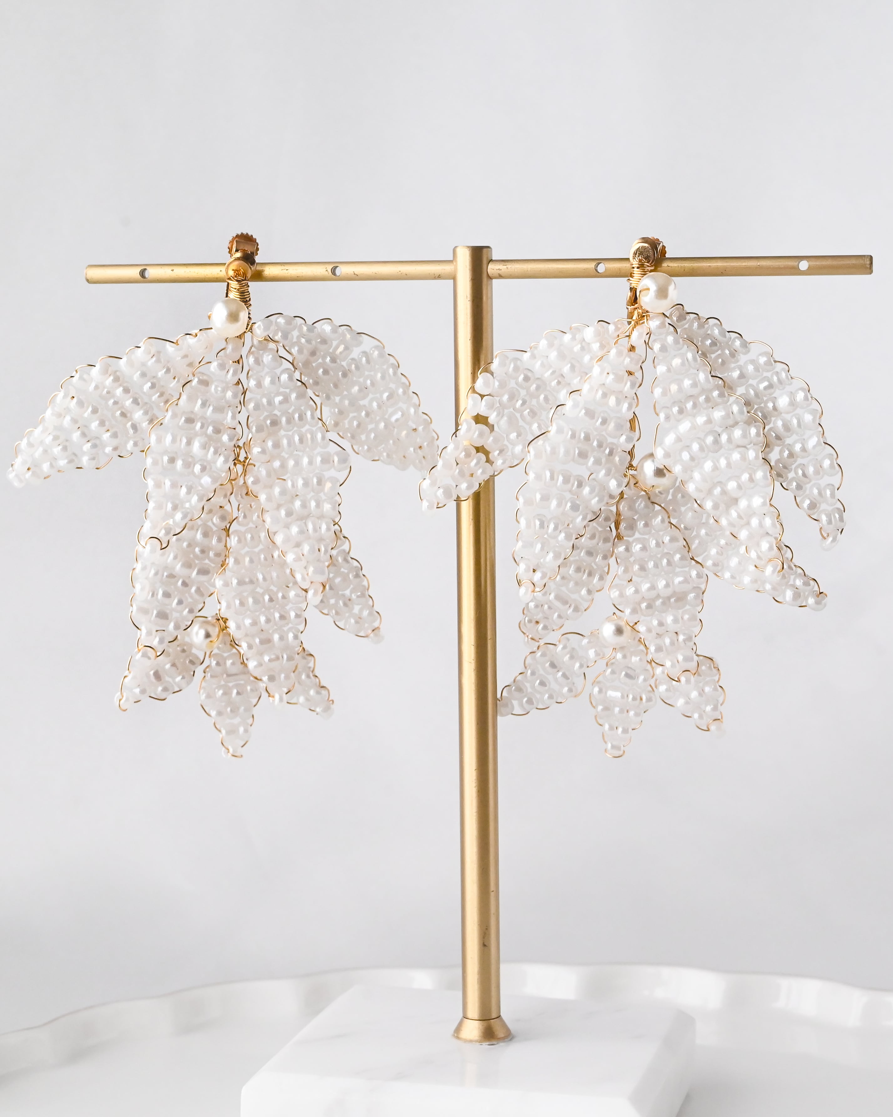 職人がビーズをワイヤで一つ一つ手作業で紡いだハンドメイドの温かみを感じされる優美でエレガントな印象のイヤリング。