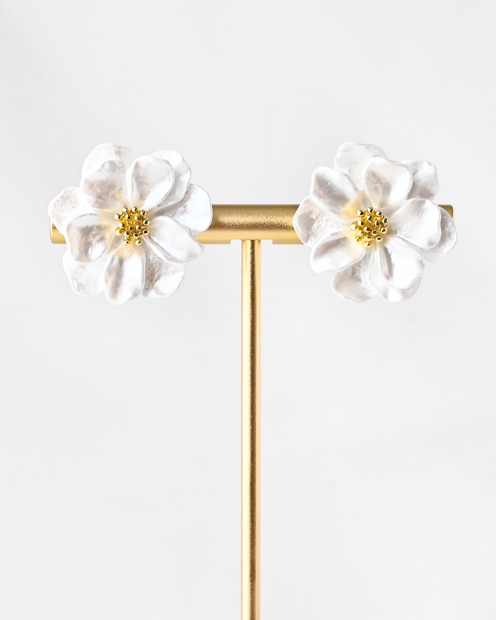 躍動感あるナチュラルな雰囲気の白いお花にゴールドの花芯がアクセントとなり、少女のような可憐さと大人花嫁さまの品の良さを絶妙にあわせ持つブライダルピアス。