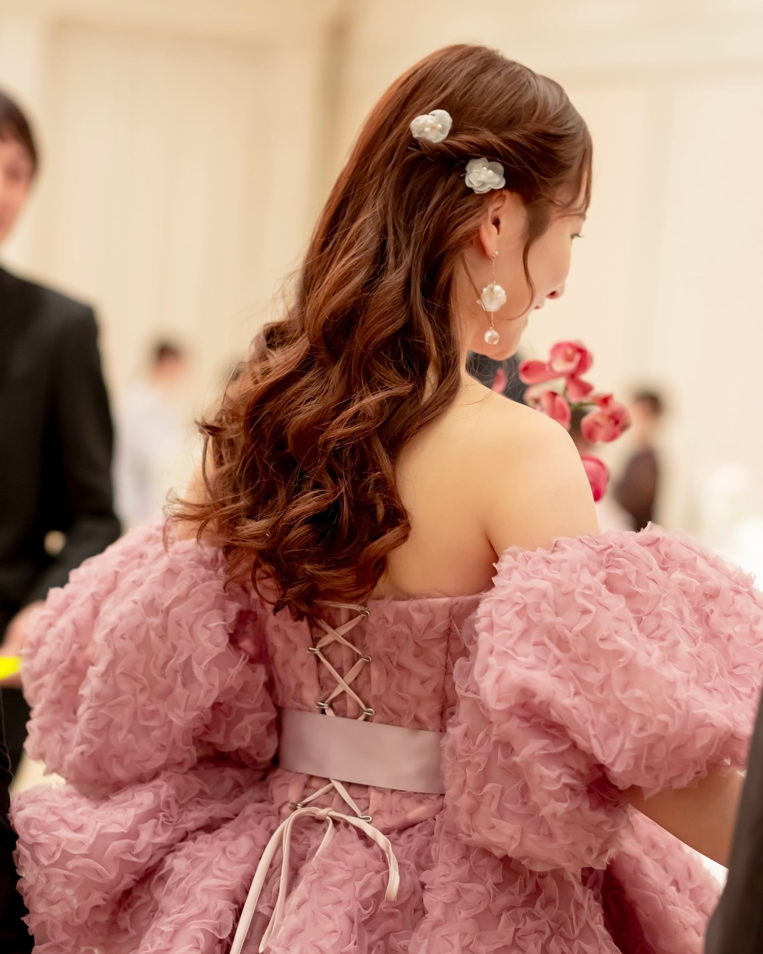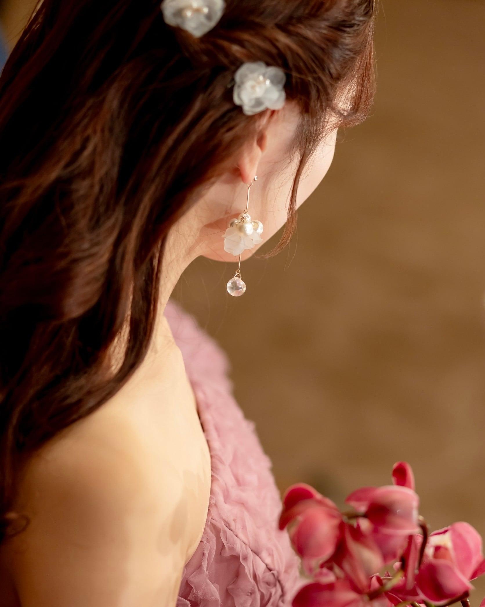 バブルビーズのタッセルが動くたびに揺れて、愛らしくもメリハリある大人フェミニンな花嫁さまを演出。