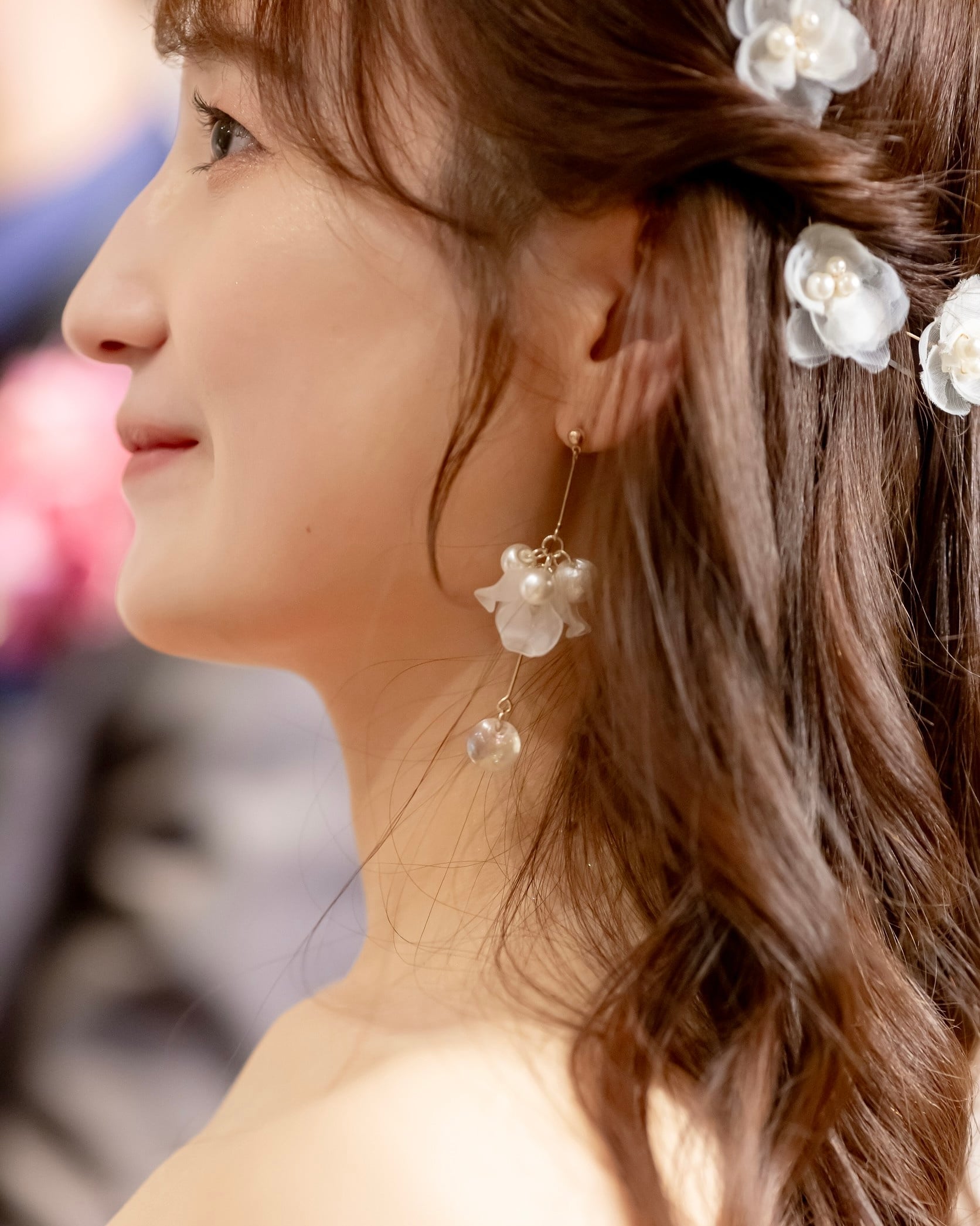 透明感ある白い花びらにコットンパールなどを合わせて上品ながらトレンド感あるデザインのブライダルピアス/イヤリング。