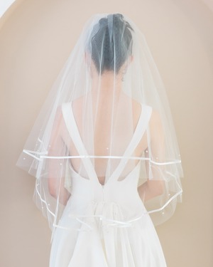 白ラインの縁飾りにパールがアクセントのウェディングベール。