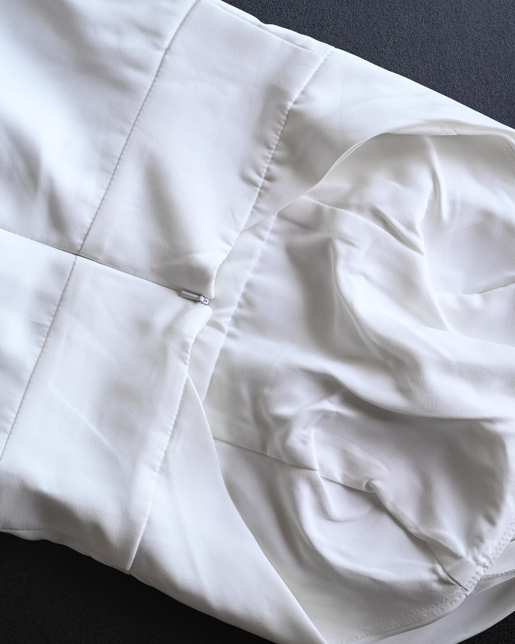 凛とした印象ながら美しいシルエットがエレガントさをプラスし、おしゃれ花嫁さまに愛される1着です。
